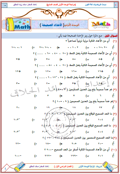 إجابات الوحدة الأولى لمادة الرياضيات للصف السابع الفصل الأول منتديات صقر الجنوب