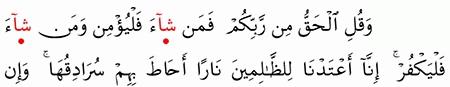 و ق ل ال ح ق م ن ر ب ك م ف م ن ش اء ف ل ي ؤ م ن و م ن ش اء ف ل ي ك ف ر إ ن ا أ ع ت د ن ا ل لظ ال م ين ن ار ا أ ح اط ب ه م س ر اد ق ه ا و إ ن ي س ت غ يث وا ي غ اث وا ب م اء ك ال م ه ل.