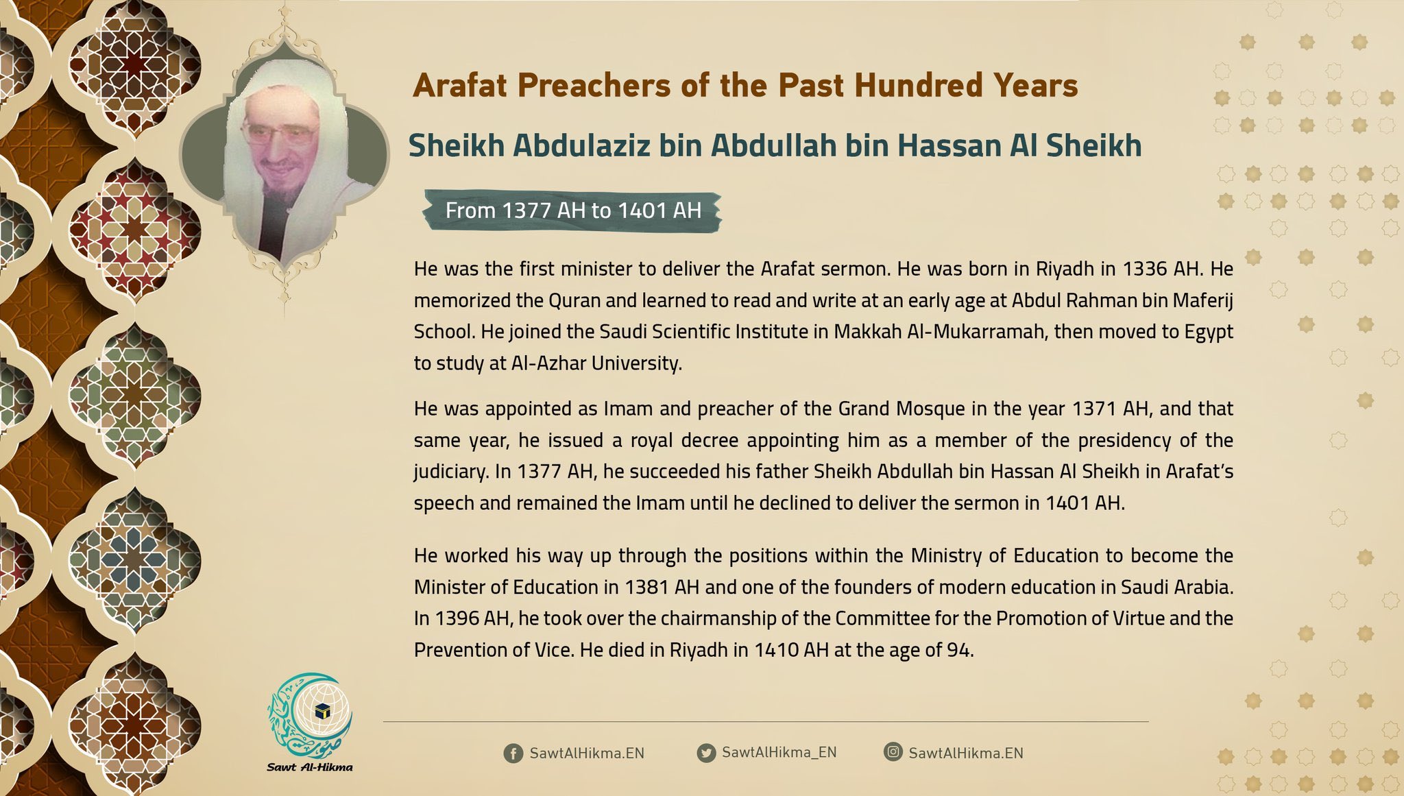 Oic On Twitter Arafat Preachers Of The Past Hundred Years Sheikh Abdulaziz Bin Abdullah Bin Hassan Al Sheikh Was The First Minister To Deliver The Arafat Sermon From 1377 Ah To 1401